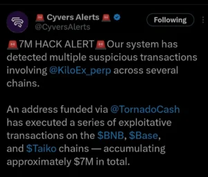 KiloEx has suffered a $7 million hack affecting BNB Smart Chain, Base, and Taiko. The attacker, using a wallet funded via Tornado Cash, exploited a price oracle vulnerability to manipulate cross-chain asset pricing.