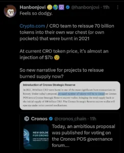 The burn previously reduced the supply from 100 billion to 30 billion CRO ahead of Cronos’ mainnet launch. Still, the proposal has faced criticism from many in the community, with only a few being optimistic about the supply restoration.