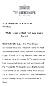 The event, spearheaded by President Donald Trump, will feature CEOs, investors, and members of the Presidential Working Group on Digital Assets, including David Sacks and Bo Hines.