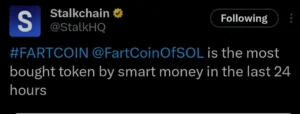 According to Stalkchain, FARTCOIN was also the most purchased token by smart money investors. The Solana-based meme token had a major rally recently following Bitcoin’s (BTC) recent correction.