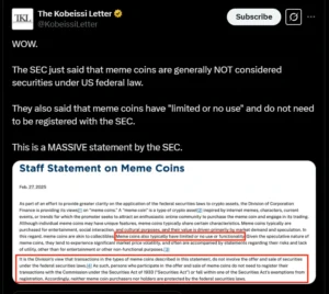The SEC further clarified that meme coins are not considered securities because they don’t generate yields or provide rights to business assets or future profits. Instead, they are bought for entertainment, social interaction, or speculative purposes.